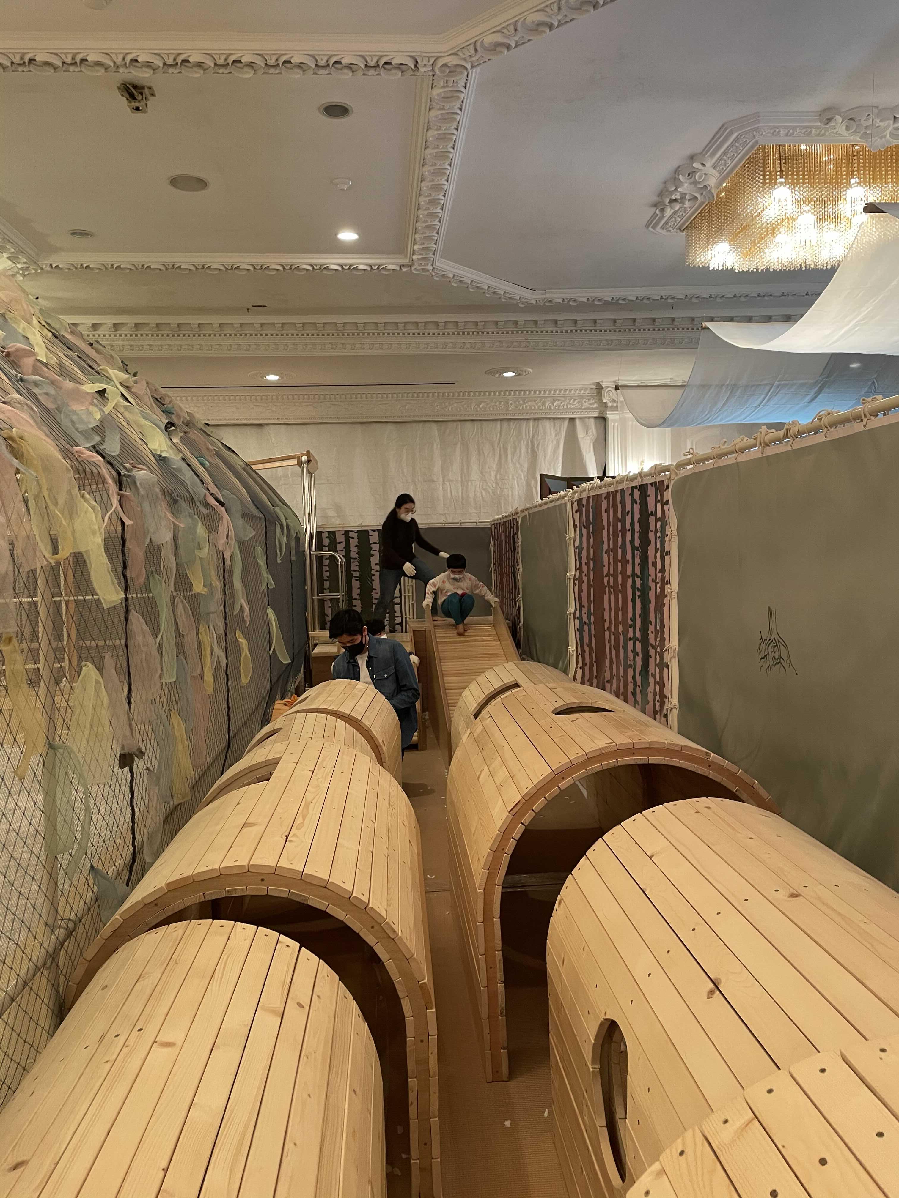 나무로 만든 악기, 신발, 놀이감과 종이조각이 잔뜩 있는 사랑스런 공간이지요.
