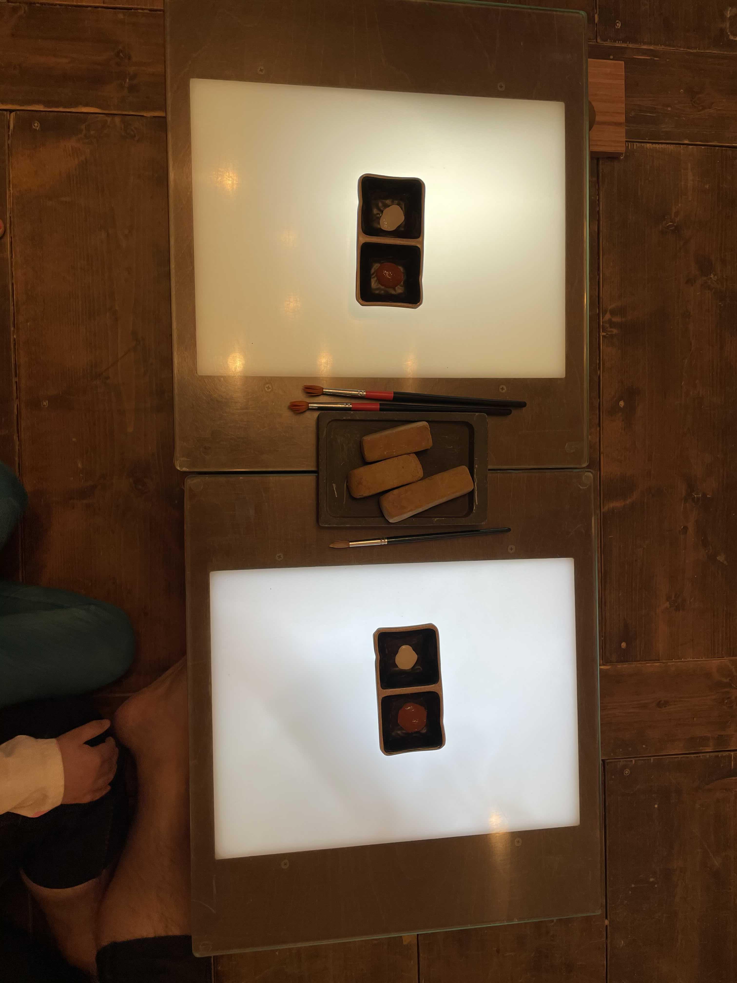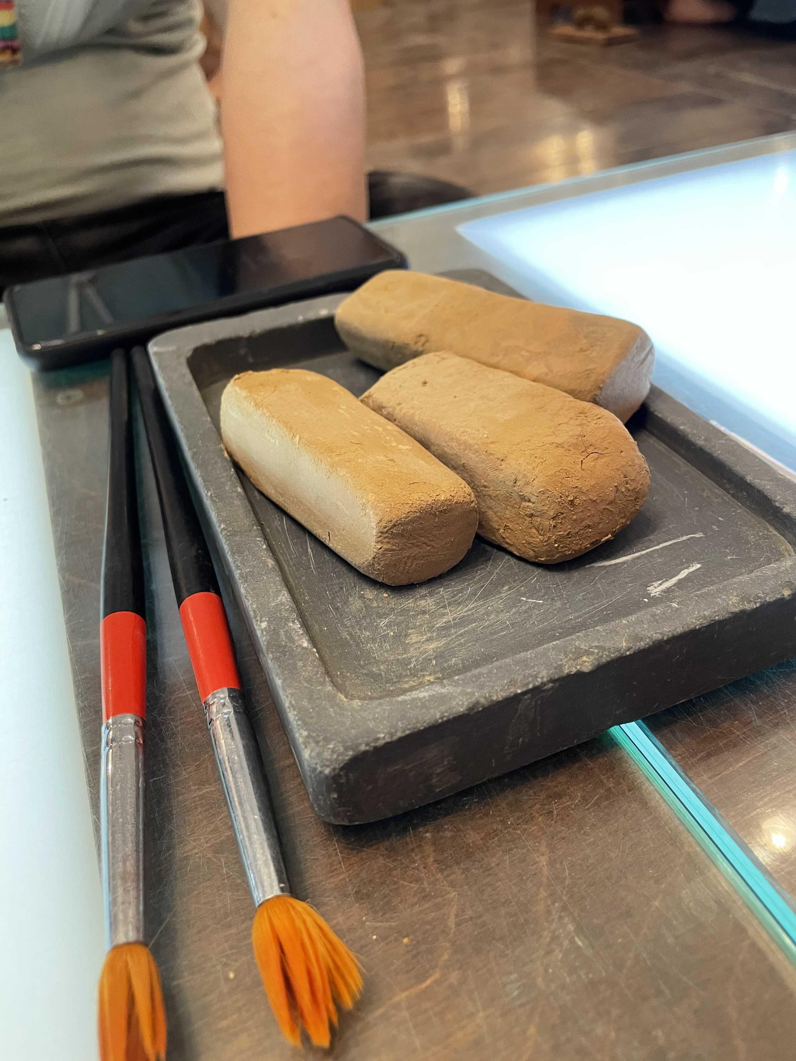 가운데 똥처럼 생긴 건 흙먹이예요. 나중에 이걸 물에 이겨서 그림을 그려요.