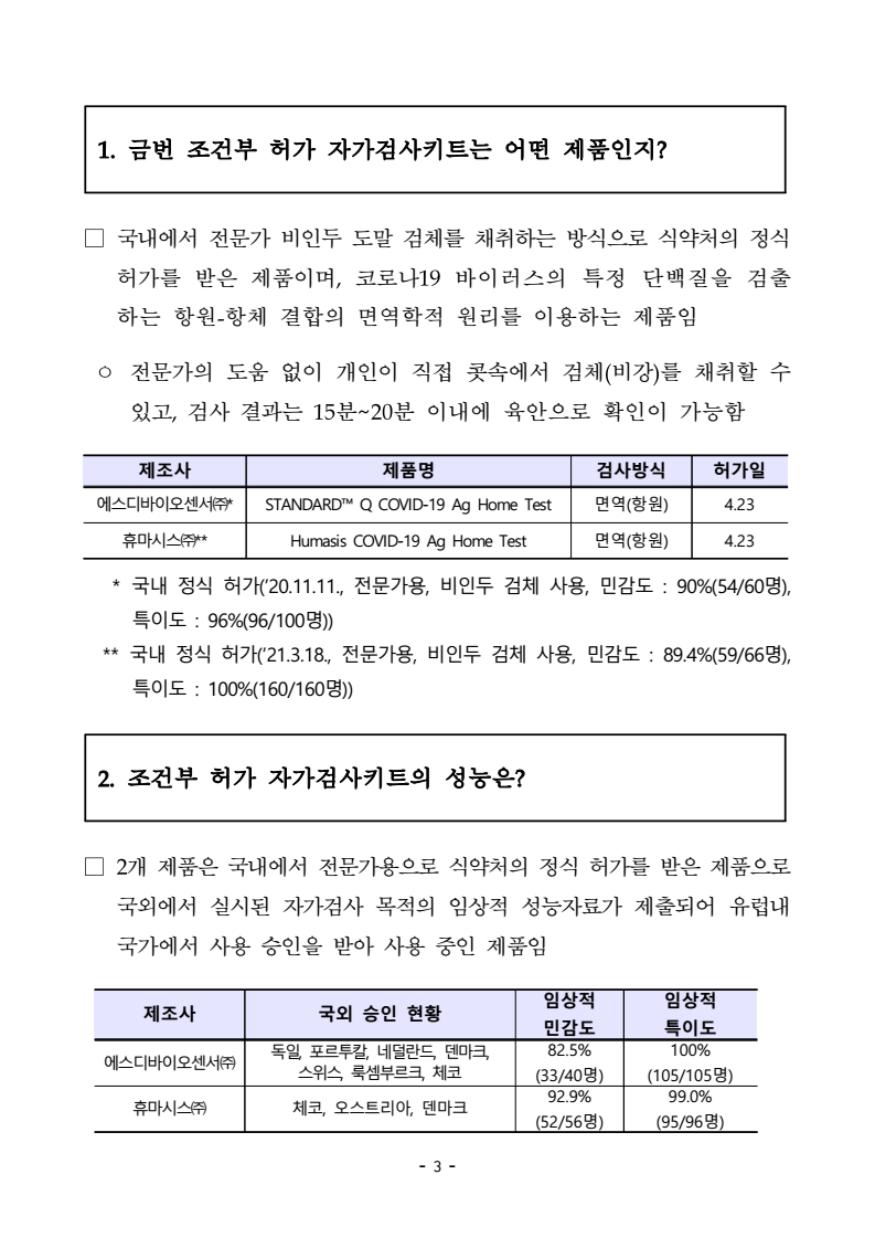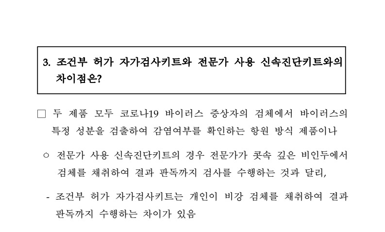 그럼 올 4월 23일부로 조건부 허가된 자가검사키트는 무엇인지, 효과면에서 어떠한지 한번 살펴보겠습니다.