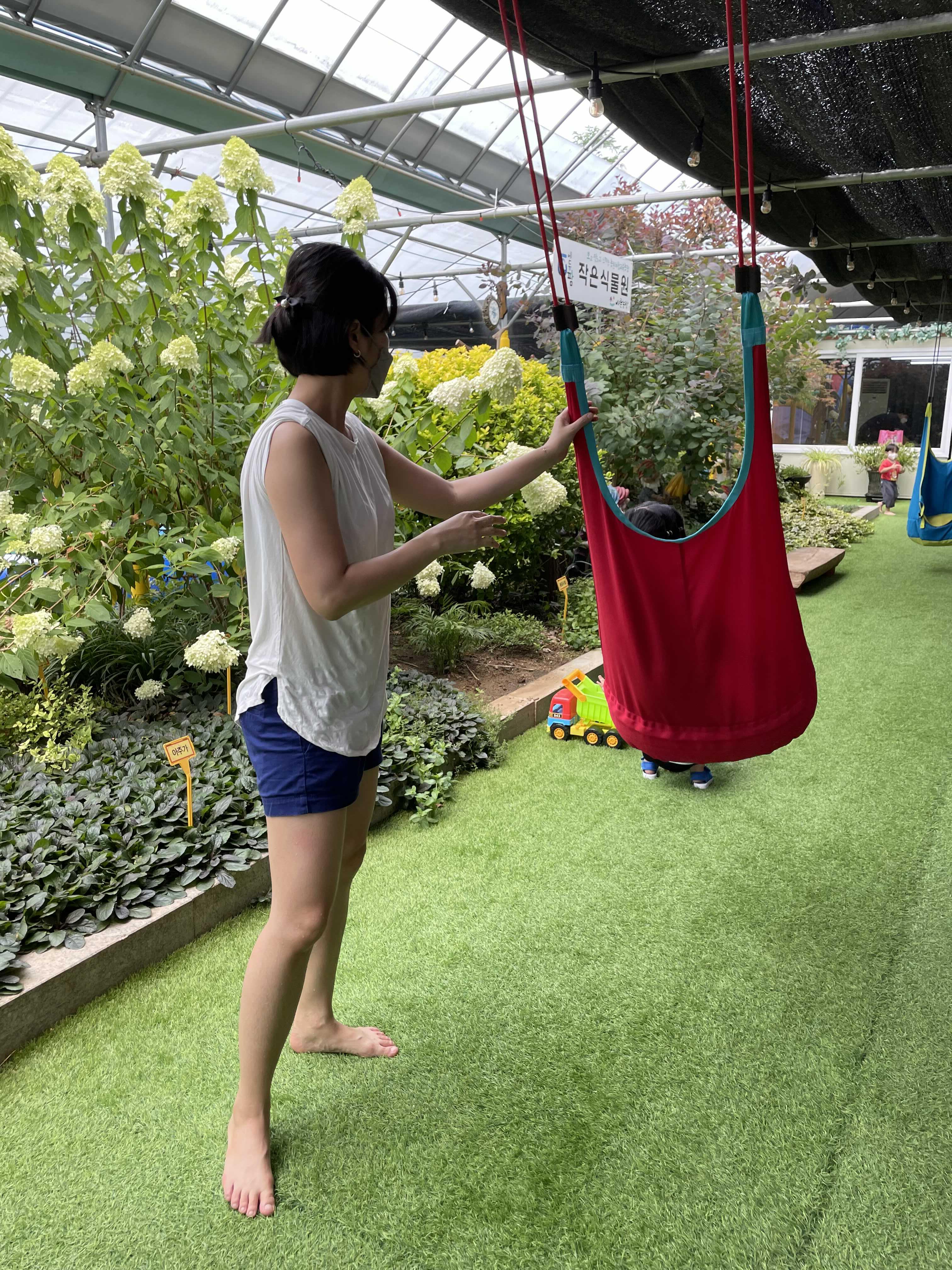 안전한 형태의 그네라 아이들이 타기 좋아요.