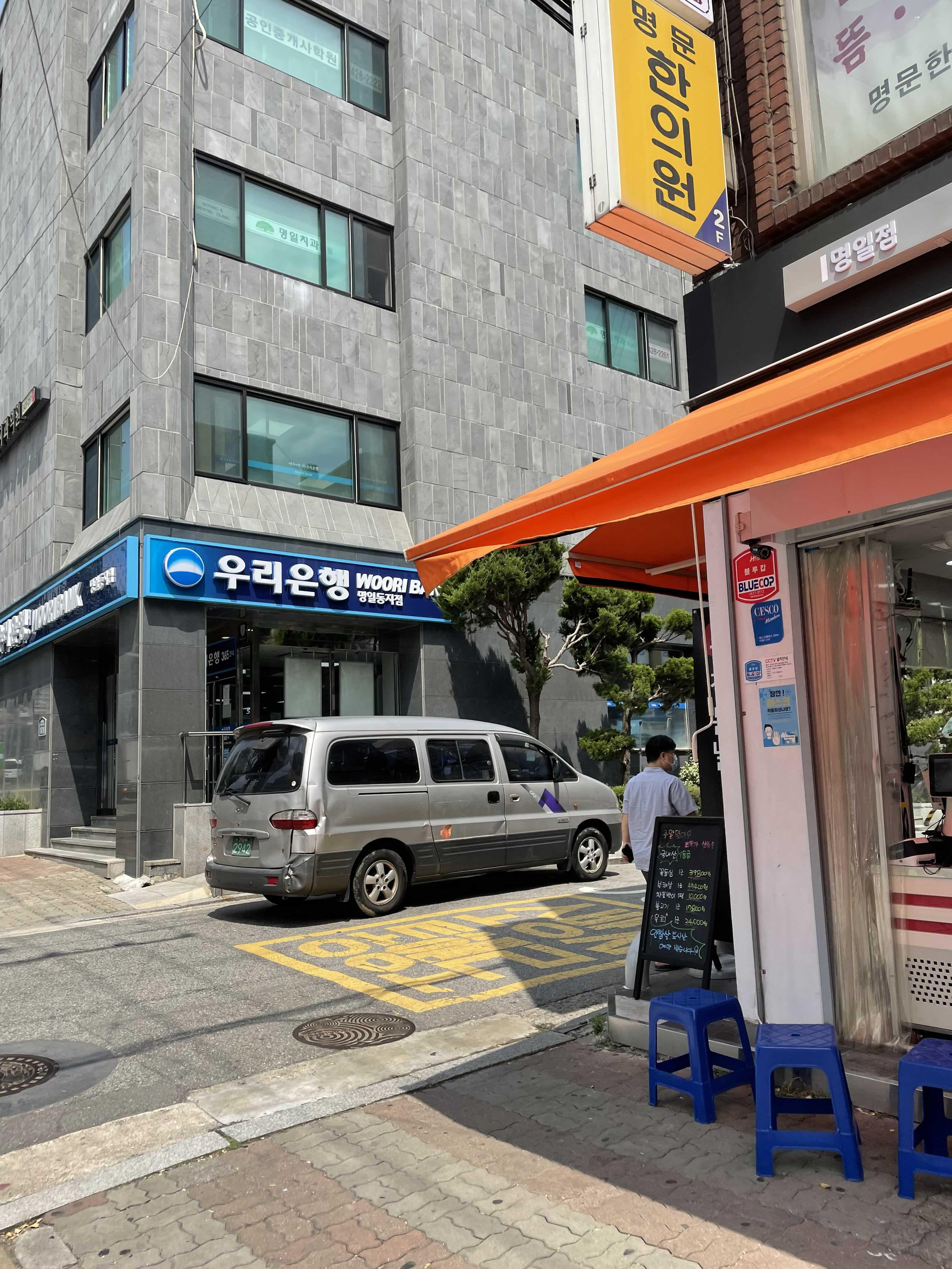 명일역과 식당 사이 우리은행이 있는데