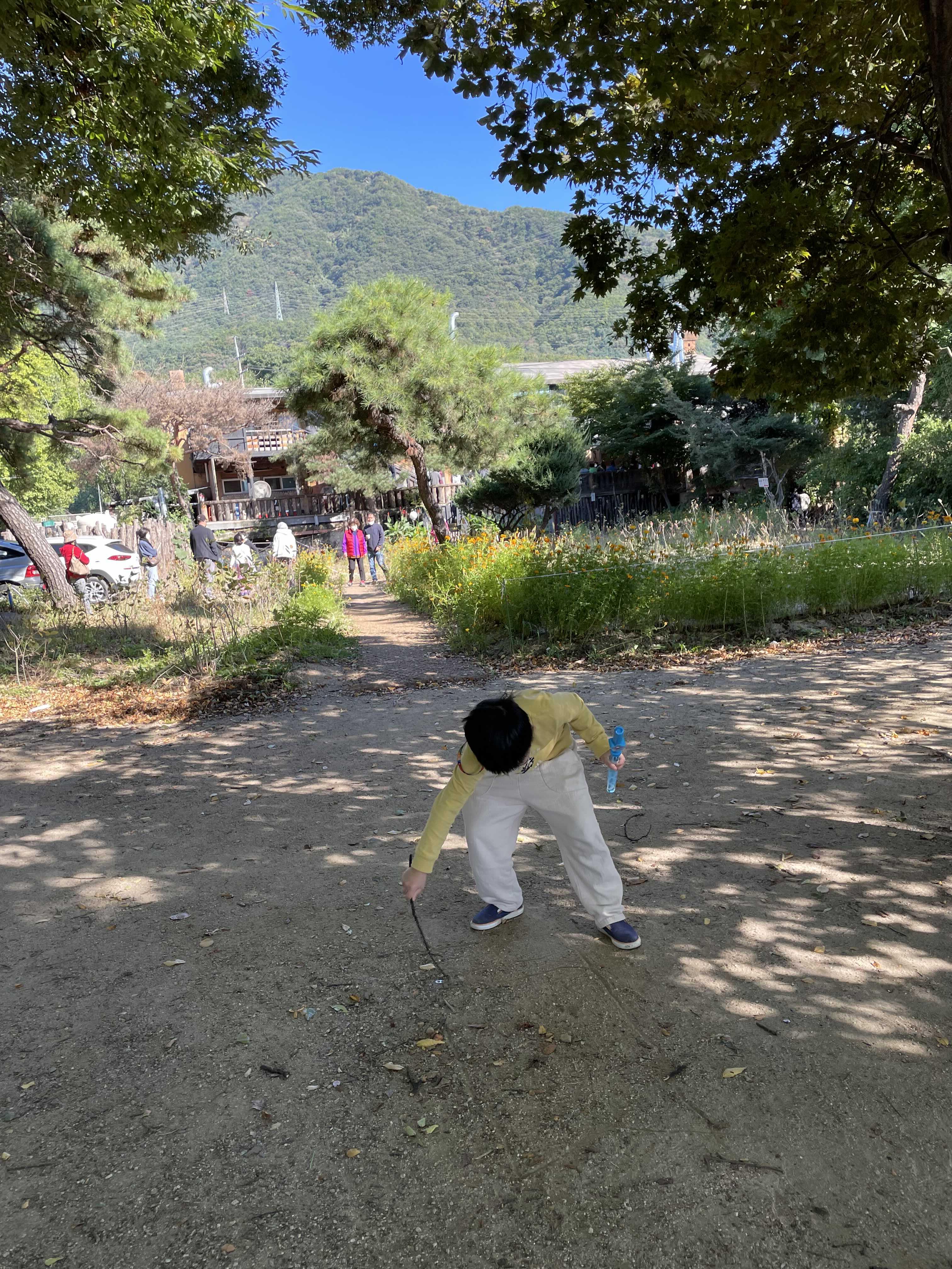 아이와 함께 나무그늘에 오방치기도 하고