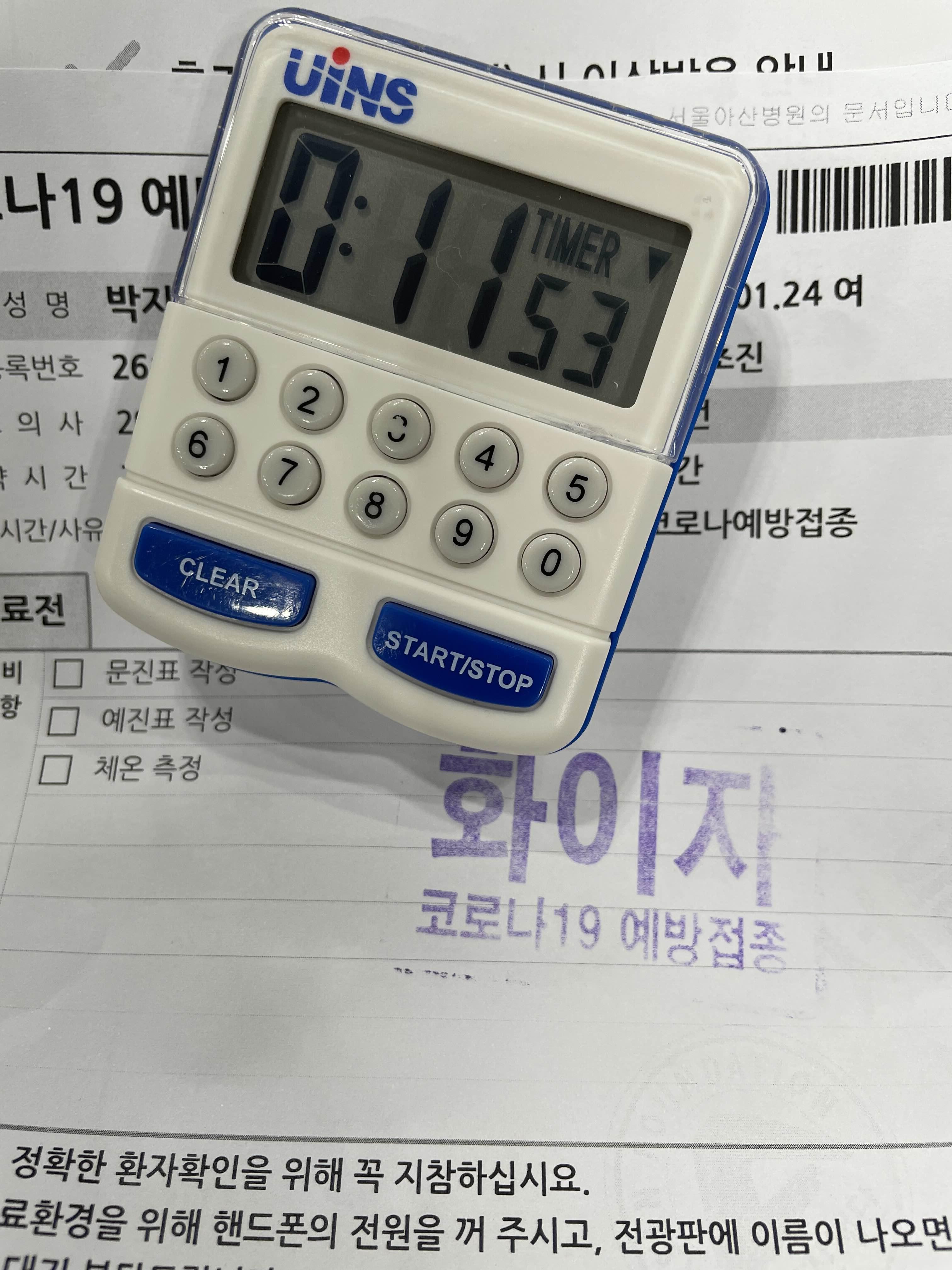 주사 후 15분이 세팅 된 타이머를 개별 소지하고 기다립니다.