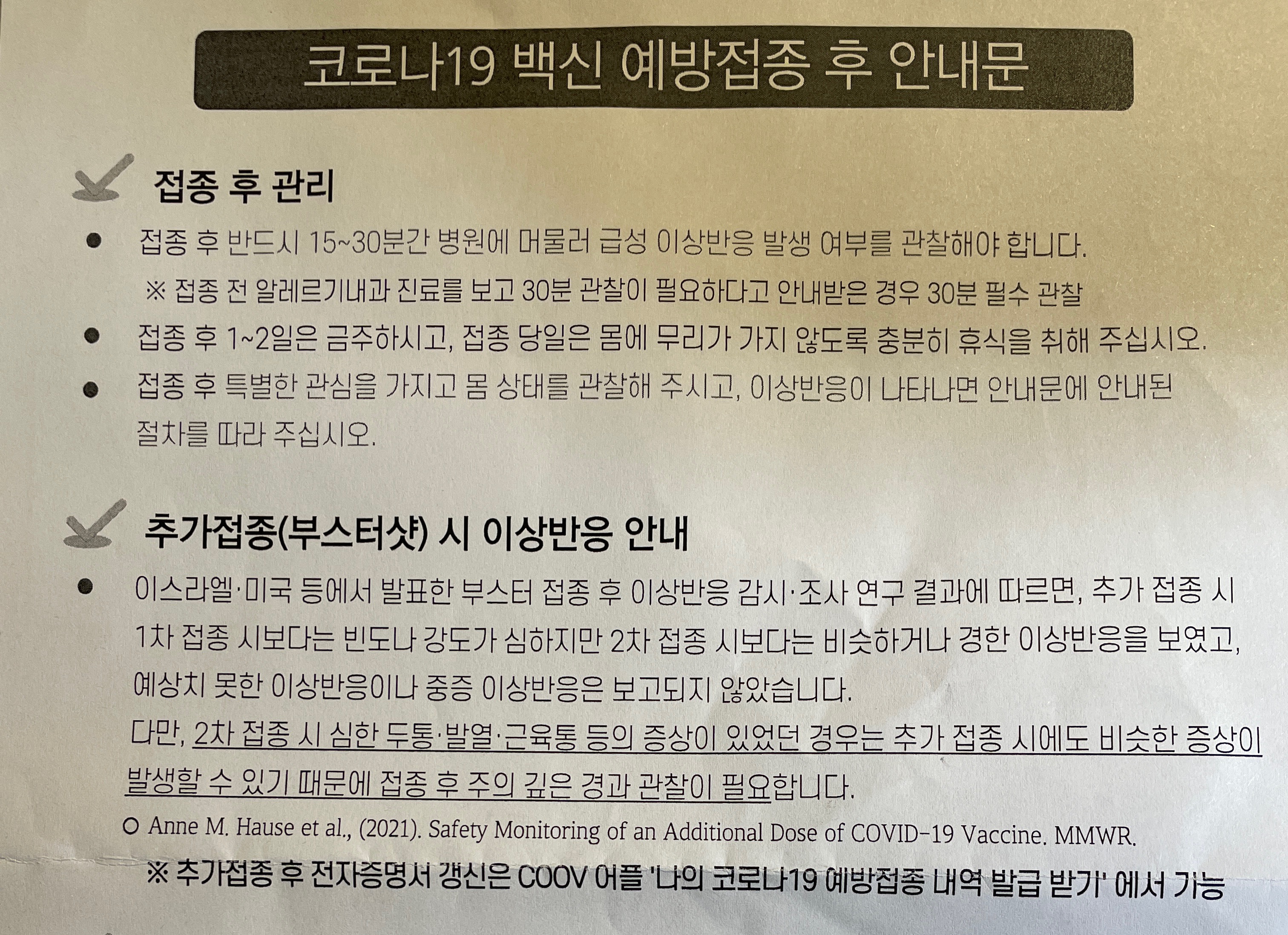 팔은 좀 아팠으나 열이나 그 외 부작용 없이 부스터접종을 마쳐 정말 다행이라 생각됩니다.