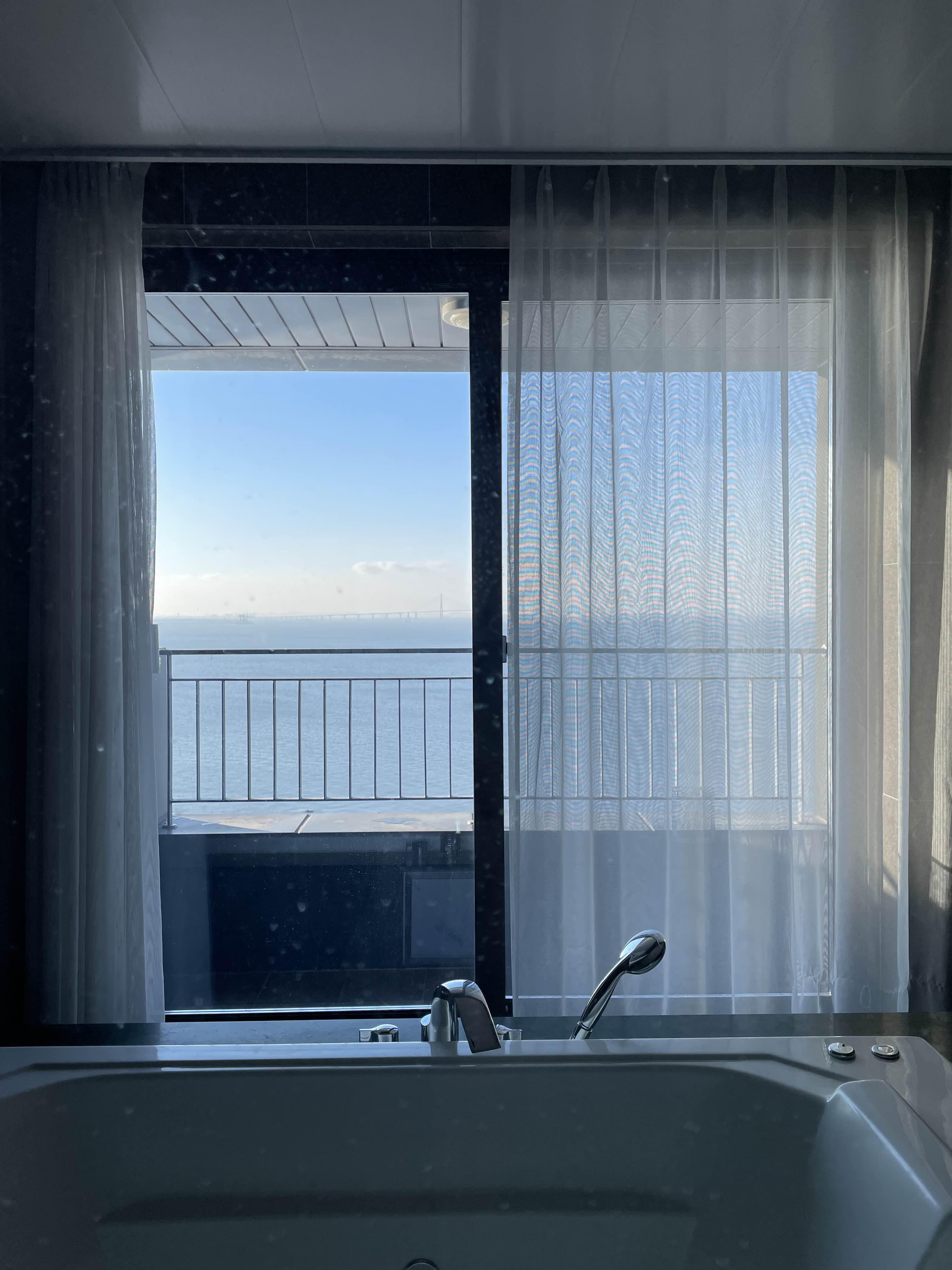 욕조가 베란다에 있어서 답답하지도 않고 방과 유리로 막혀있어 욕조에서 티비도 볼 수 있어요.