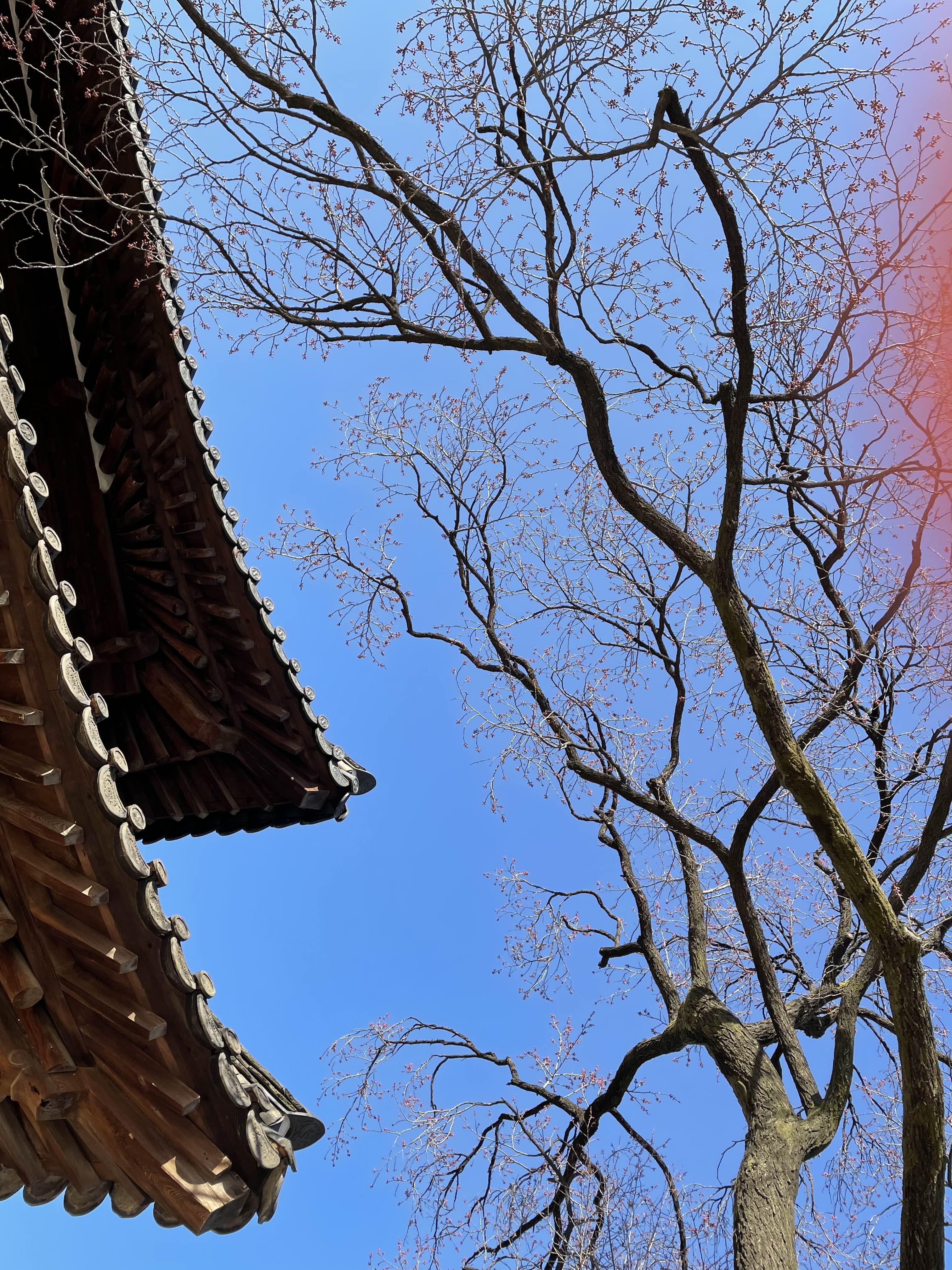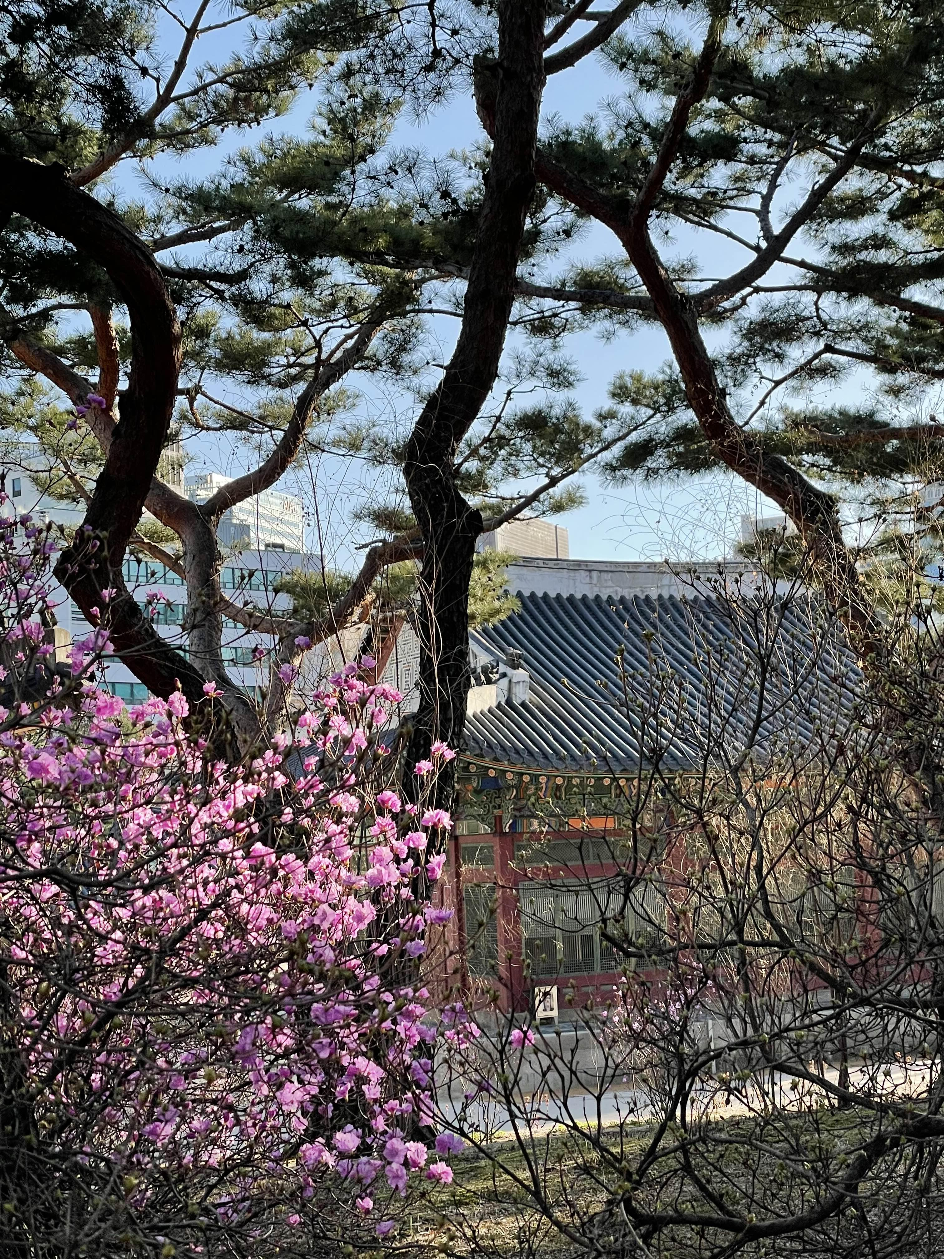 전각들 뒤쪽에 있는 아담한 뜰에 핀 진달래, 개나리..