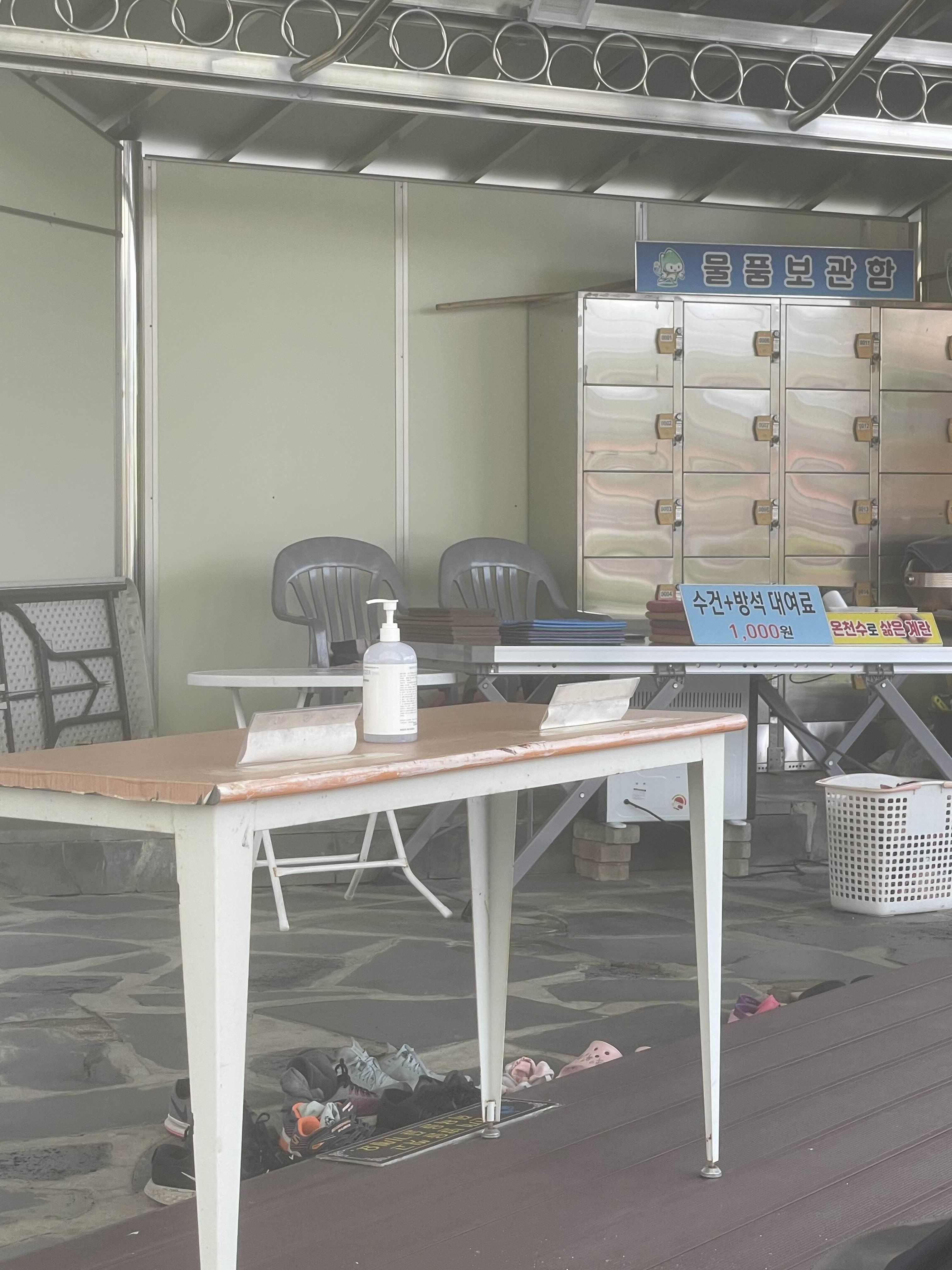 앞뜰에 주차 후(무료) 입구에서 인원수대로 이용료를 결제하면 방석과 수건을 하나씩 주셔요.