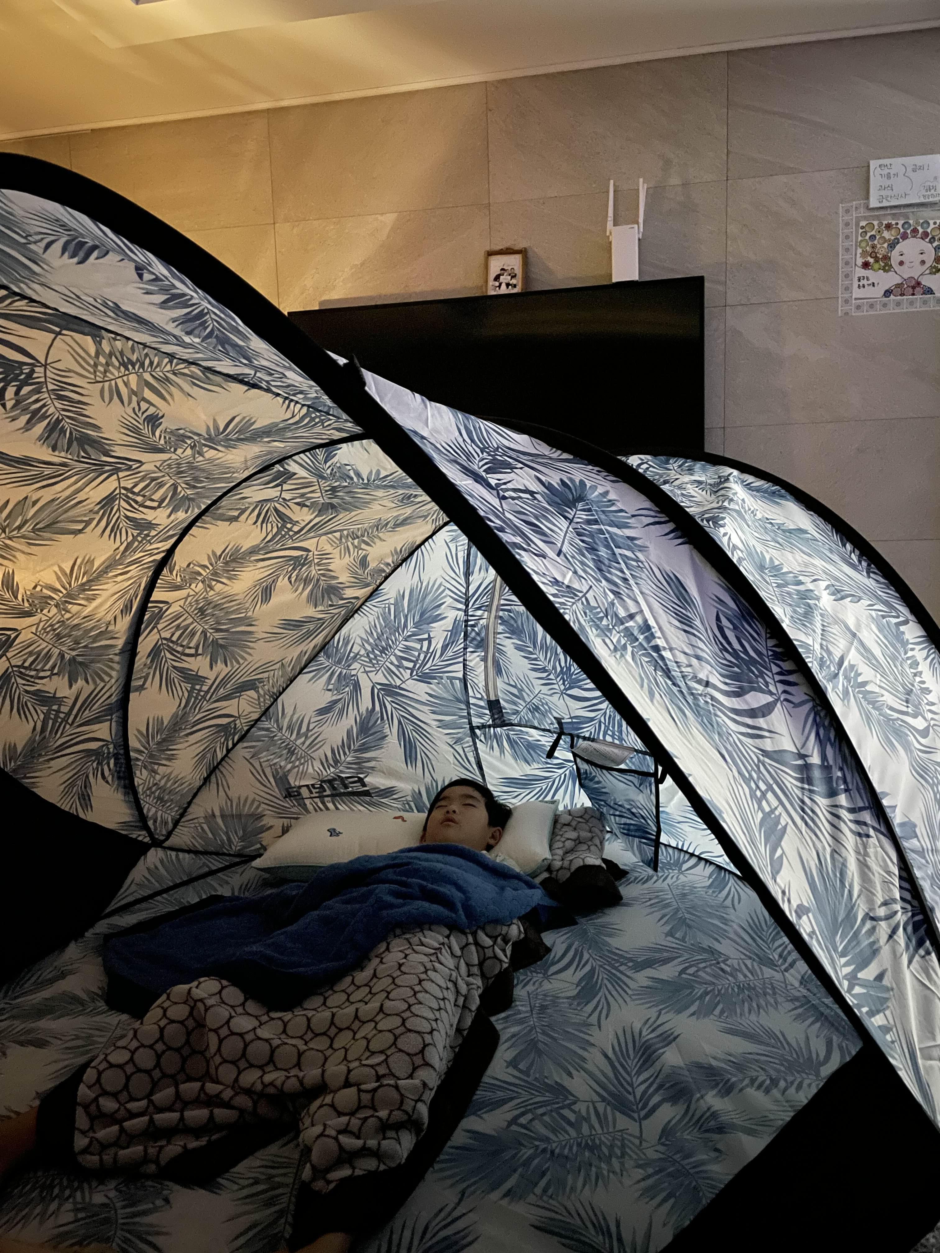 강아지 텐트를 상시 노리던 아이였는데, 드디어 자신만의 텐트가 생겨서 자고 일어나면 스스로 텐트펴고 놀아요.