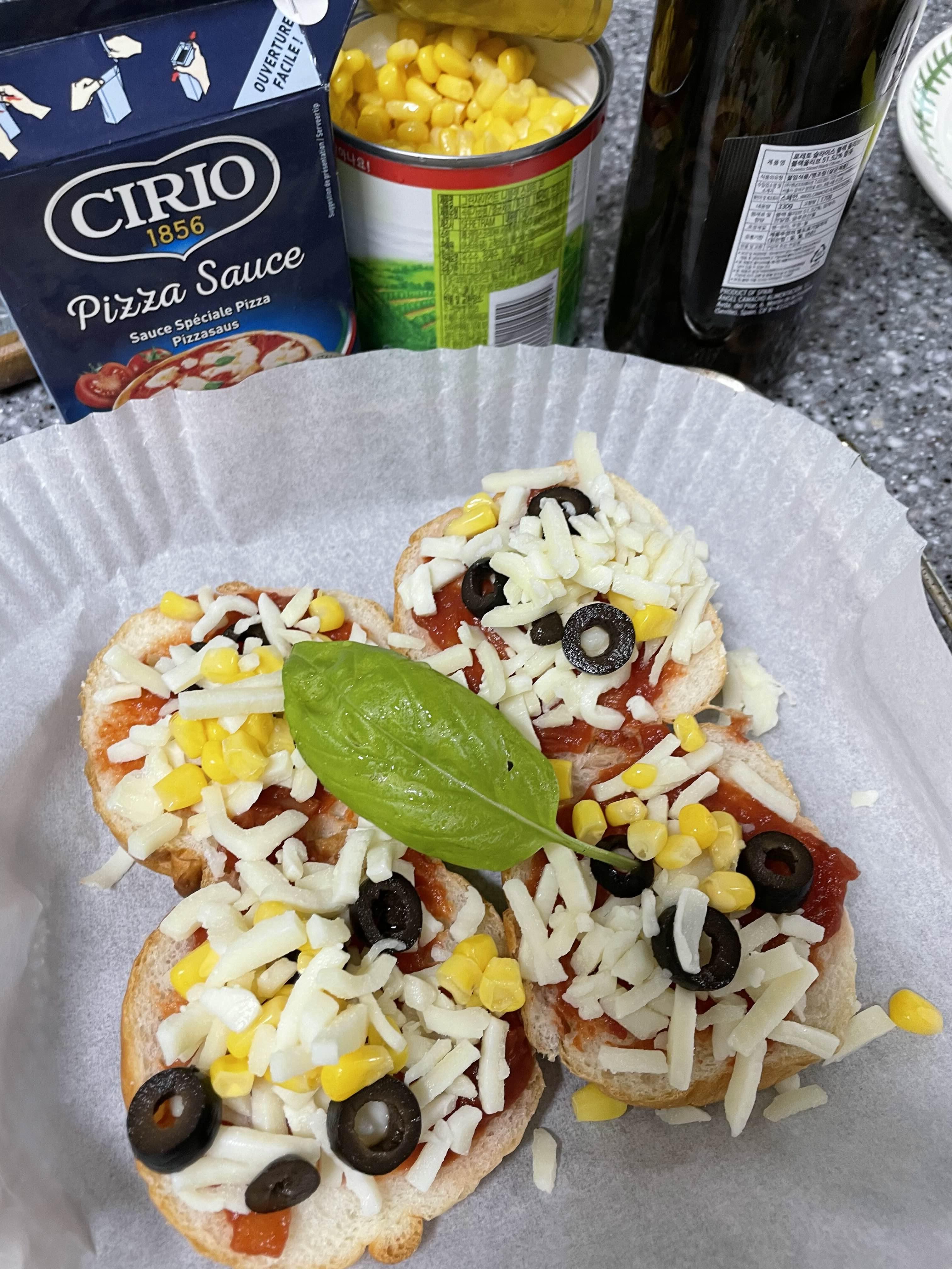 재 료: 피자소스, 옥수수캔, 슬라이스 블랙올리브, 피자치즈, 바질 몇장