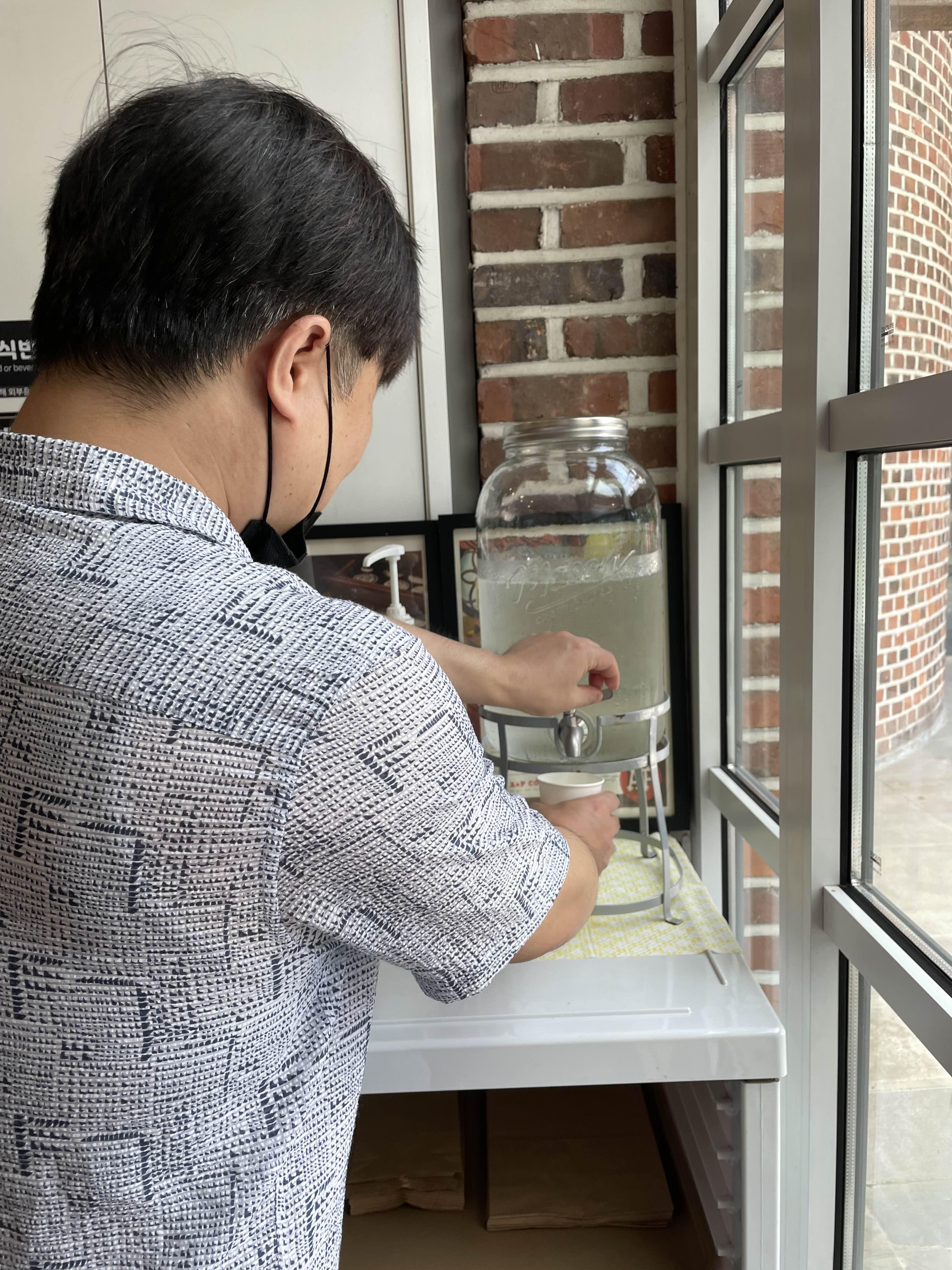 입구에 딱 시원한 물이 준비되어 있어요.