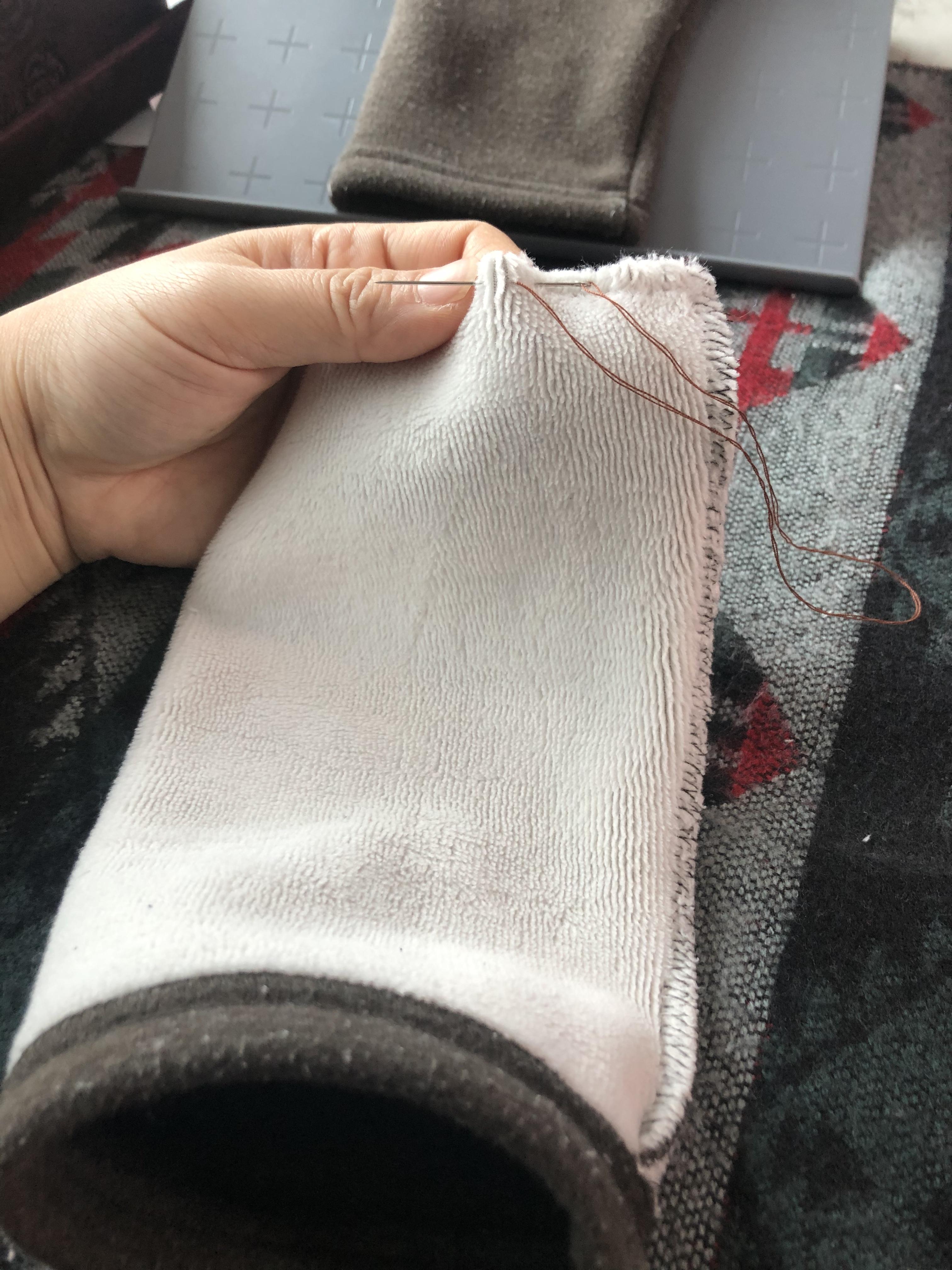 3. 손잡이크기에 맞춰 바느질을 뜯어 구멍을 뚫어줍니다. 바느질이 뜯어지면 안되니깐 구멍 양끝은 감침질로 마무리해주는게 좋겠죠?